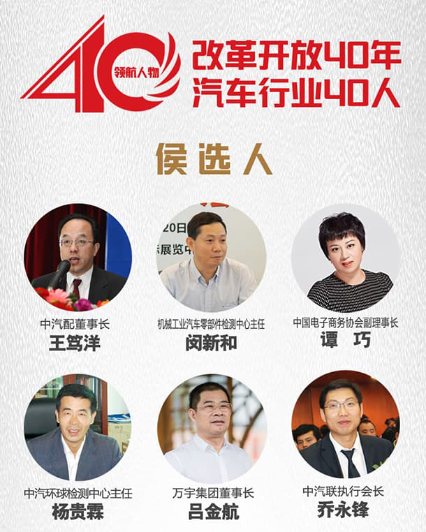 2018年,洽逢中国迎来改革开放40周年,习近平主席在博鳌亚洲论坛2018年年会开幕式主旨演讲中说,“1978年,在邓小平先生倡导下,以中共十一届三中全会为标志,中国开启了改革开放历史征程。从农村到城市,从试点到推广,从经济体制改革到全面深化改革,40年众志成城,40年砥砺奋进,40年春风化雨,中国人民用双手书写了国家和民族发展的壮丽史诗。”迎着改革开放40周年的春风,中国汽车工业也走过了半个多世纪的发展之路,近60年的风雨路程,每一个为中国汽车行业做过贡献的人都是行业的领航者。2018年,第17届中国汽车配件用品行业总评榜为中国汽车行业的发展喝彩本次评选活动以“改革开放40年,汽车行业40人”为主题,为汽车后市场行业发展呐喊助力,为实现中国汽车由“大国梦”到“强国梦”的跨越做出新的贡献,向“中国品牌节”献礼!
